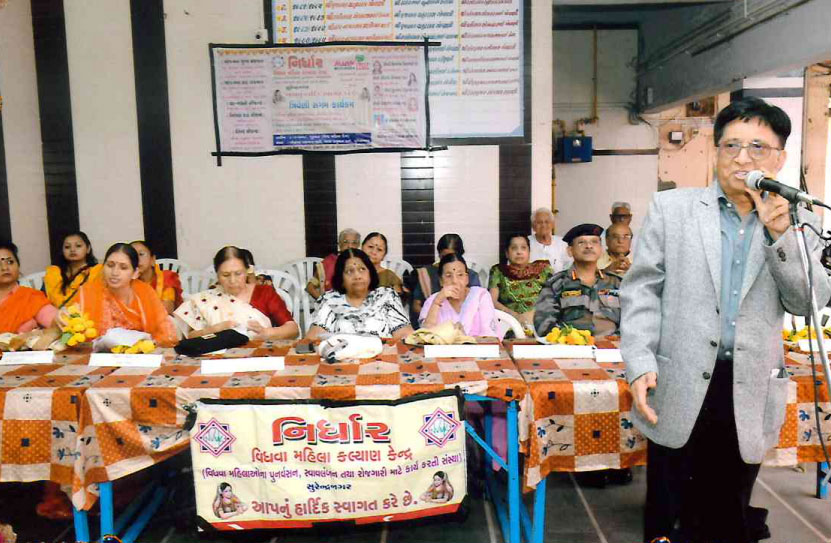 વિધવા મહિલાઓને સ્વમાનભેર આગળ વધવા ચાવીરૂપ પ્રવચન કરતા એસ.એસ. વાઈટ ના ચેરમેન લેખક વિચારક અને ચિંતક શ્રી રાહુલભાઈ ભાનુભાઇ આગવી મુદ્રા માં નજરે પડે છે
