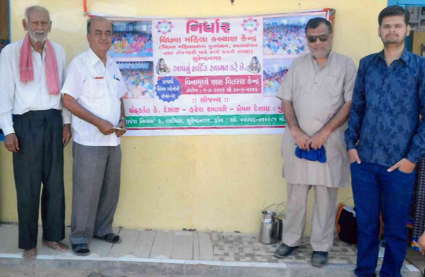 શ્રી હરીશભાઈ વાણી તથા શ્રી ચંદ્રકાંત દેસાઈ (મુંબઈ) ના સૌજન્ય થી પ્રતિ-વર્ષ એપ્રિલ, મે, જૂન ત્રિમાસિક છાશ કેન્દ્ર 51 વિધવા મહિલાઓને દરરોજ એક લીટર છાસ આપવા માટે શરૂ કરાય છે, તસવીર મા સીરીઝ શિરીષભાઈ ઓઝા, સ્થાપક ટ્રસ્ટી શ્રી રાકેશ રાવલ, આનંદ રાવલ, નિવ્રત મામલતદાર બી. આર. ખેર તસવીરમાં નજરે પડે છે