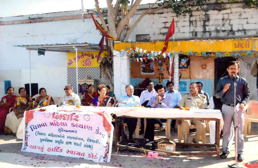 નિર્ધાર વિધવા મહિલા કલ્યાણ કેન્દ્ર દ્વારા રક્ષાબંધન પર્વ નિમિત્તે 11વિધવા બહેનોની ટીમ સાથે સબજેલ સુરેન્દ્રનગર માં કેદી ભાઈઓ ને રક્ષાબંધન કરી તેમનું જીવન માનવ્ય અભિગમ તરફ વળે તેવો પ્રયાસ આ સંસ્થા તરફથી કરવામાં આવે છે પ્રસ્તુત તસ્વીર માં તમારો સમારોહના પ્રમુખ શ્રી કિશોરસિંહ ઝાલા પ્રાસંગિક પ્રવચન કરી રહ્યા છે જ્યારે મંચ પર મુંબઈના ઉદ્યોગપતિ દંપતી સોહીણીબેન શાહ, ગુણવંત શાહ તથા સંસ્થાપક શ્રી રાજેશ રાવલ તત્કાલીન અધીક્ષક શ્રી ગઢવી ભાઈ તસવીરમાં દ્રશ્યમાન થાય છે